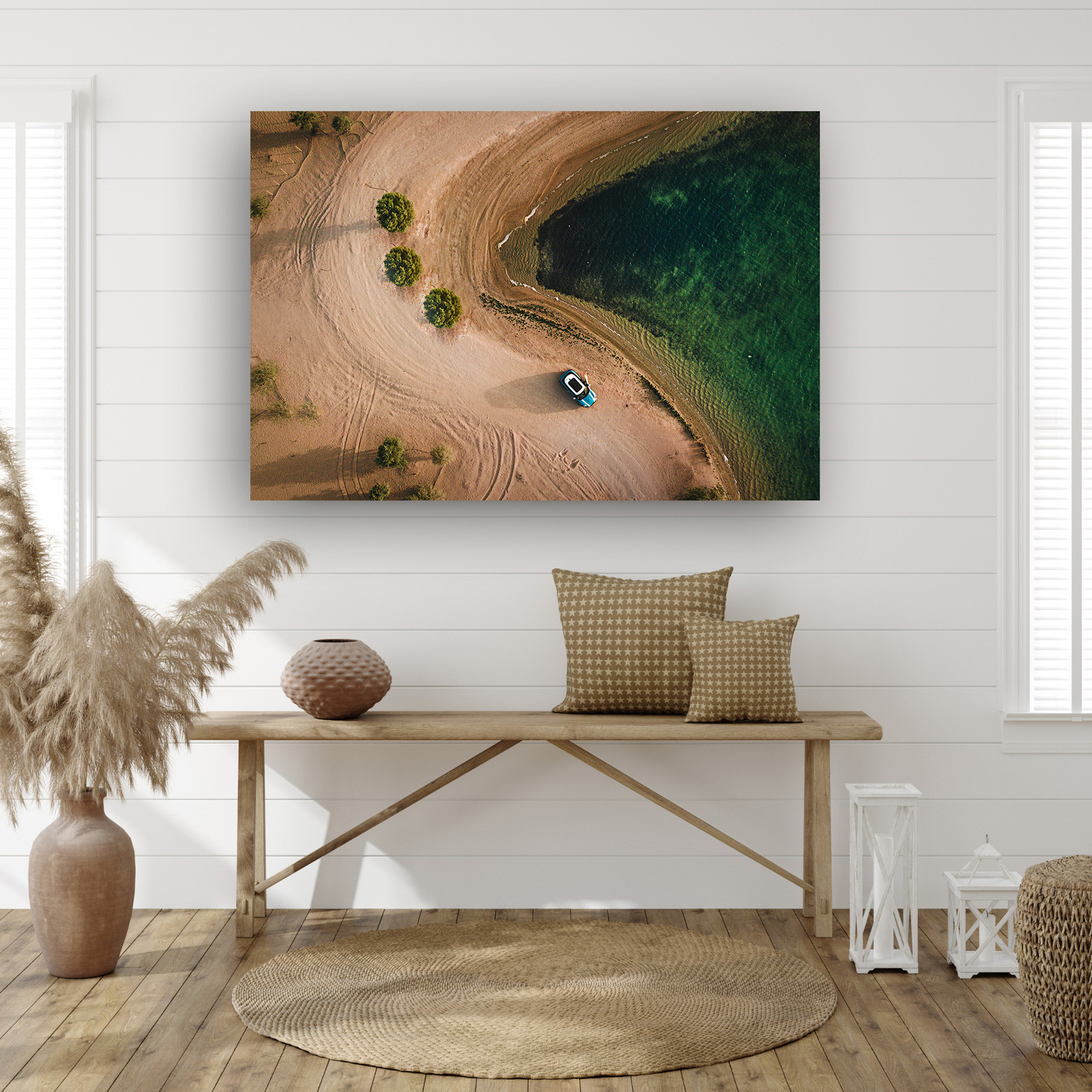 Leinwandgemälde Auto Sand Bäume Wasser Sommer 90x60