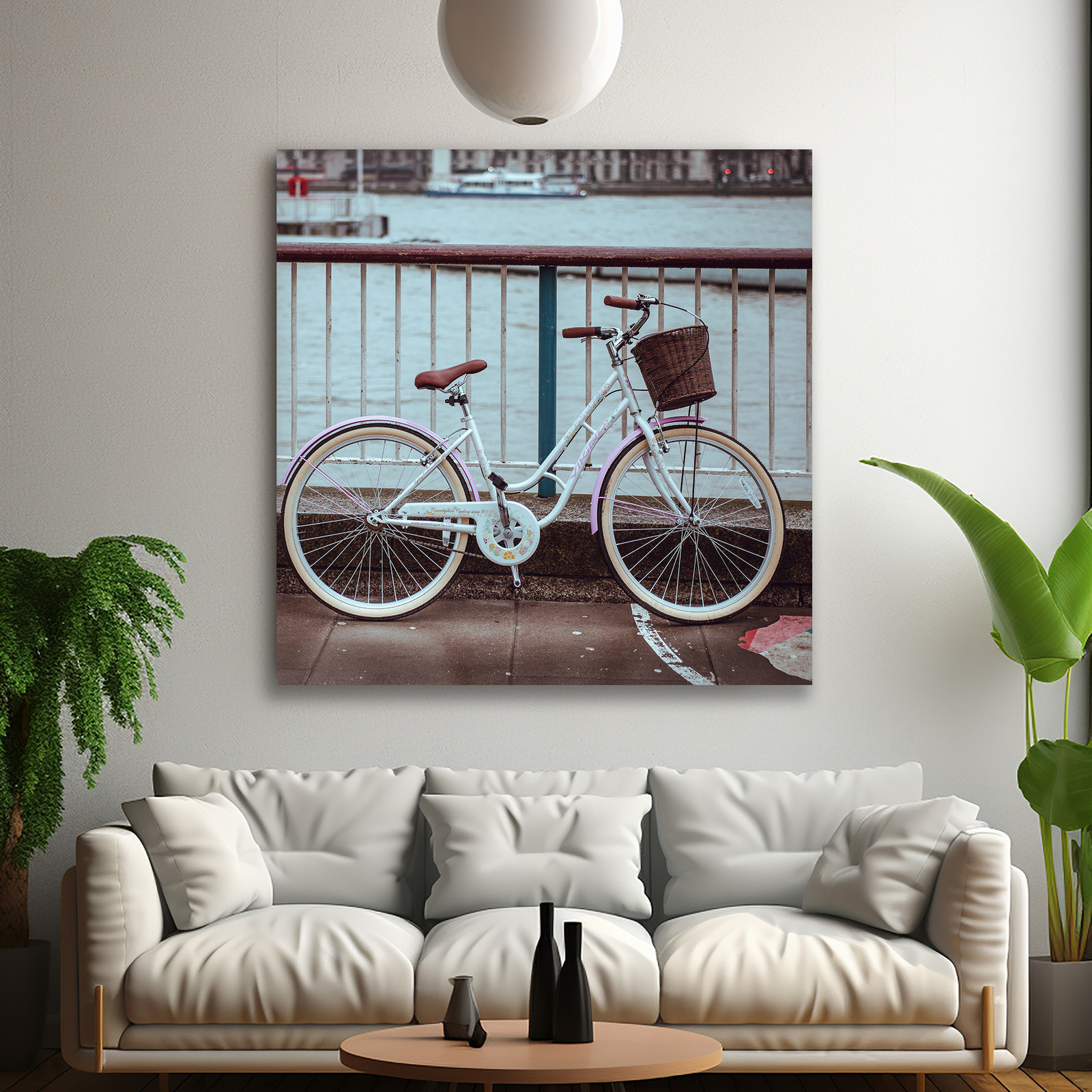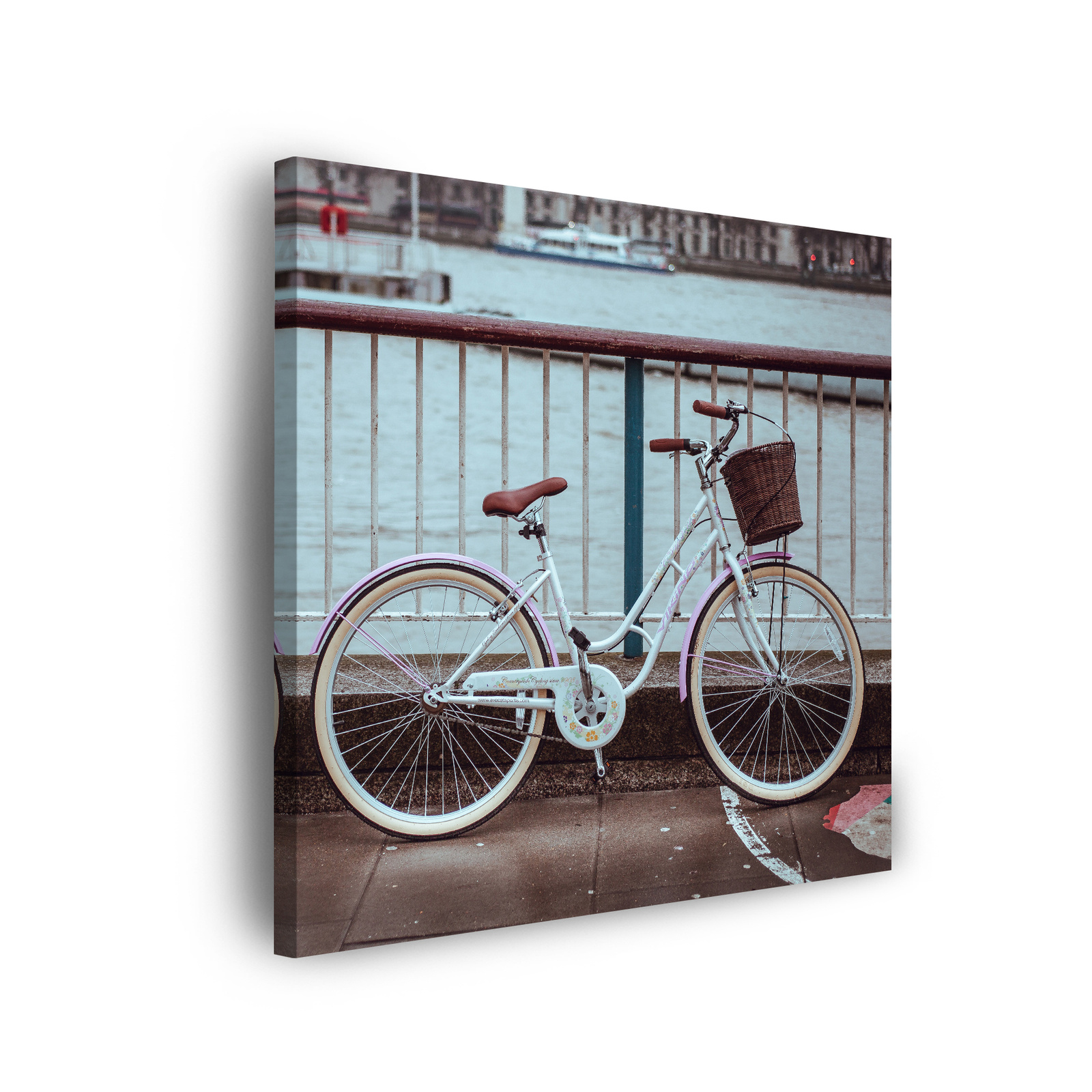 Leinwandgemälde Vintage Fahrrad in der Stadt an der Brücke 90x90